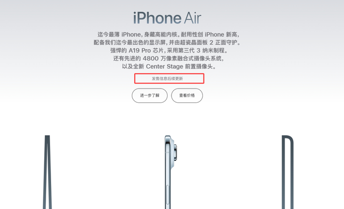 苹果 Apple Store 官网将 iPhone Air 发售时间改为“发售信息后续更新”“所有机型将在获得批准后发售”。