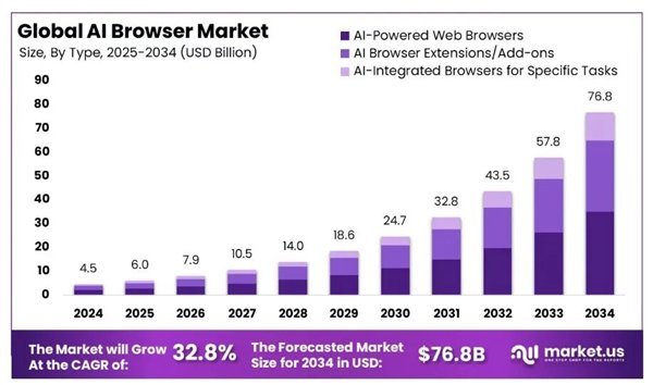 这也是为啥科技巨头争先涌入 AI 浏览器的赛道。根据 market.us 的统计报告,全球 AI 浏览器市场可能在 2034 年增长至 2024 年的 17 倍。