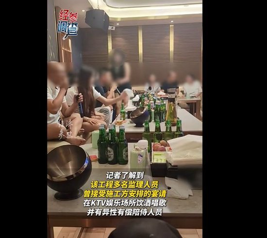 记者获取的视频显示,该标段监理单位华东咨询公司的多名监理人员曾接受施工方宴请,在KTV娱乐场所饮酒唱歌,每人身边均有一至两名异性有偿陪侍人员。据知情人士透露,监理等相关方与施工方的此类违规行为并非首次发生。