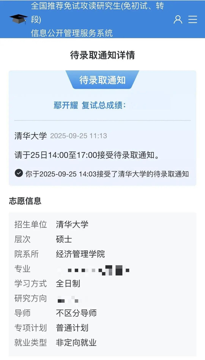 功夫不负有心人,他收获了北京大学、上海交通大学的研究生录取通知和清华大学的研究生候补录取名额。鄢开耀说,他是先被北大汇丰商学院录取的,但十几万的学费对家庭是巨大的负担,让他辗转反侧,“清华面试我发挥不好,只拿到了补录取名额,那一晚我崩溃大哭,不知道是不是父亲听到了我的哭声,10天后,我竟然等到了清华大学经济管理学院的录取通知!”
